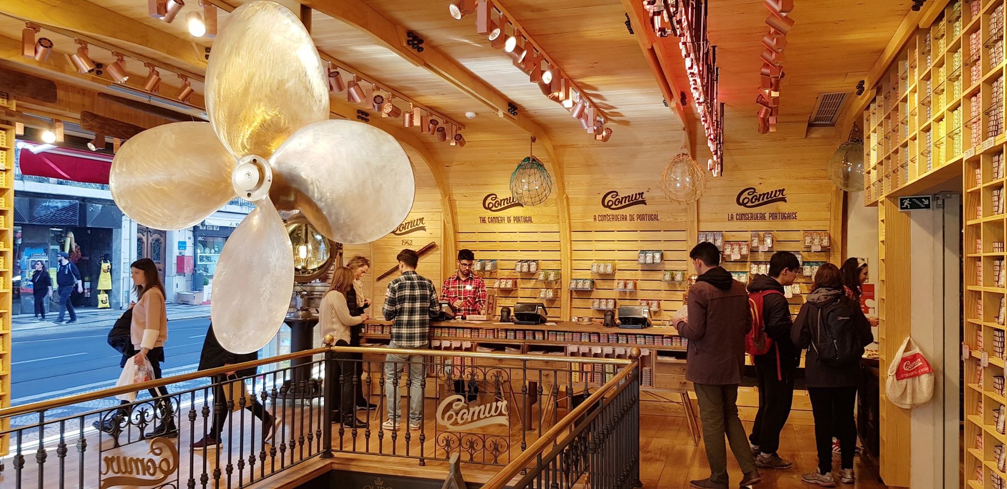 Um espaço que convida a entrar e a observar com atenção, com expositores inusitados e trabalhados para realçar as latas de sardinha.
