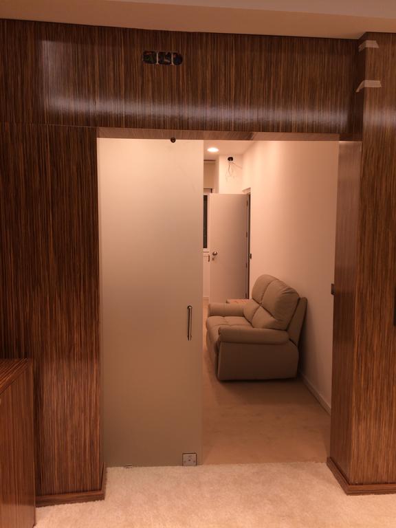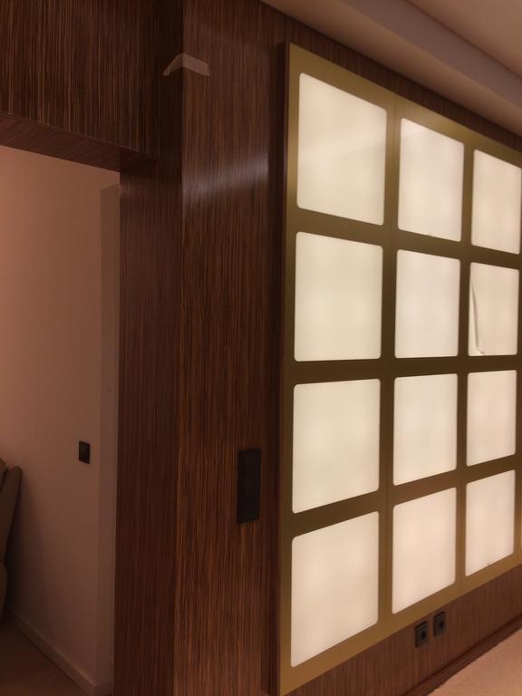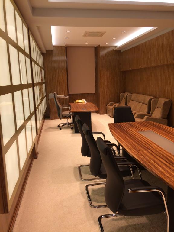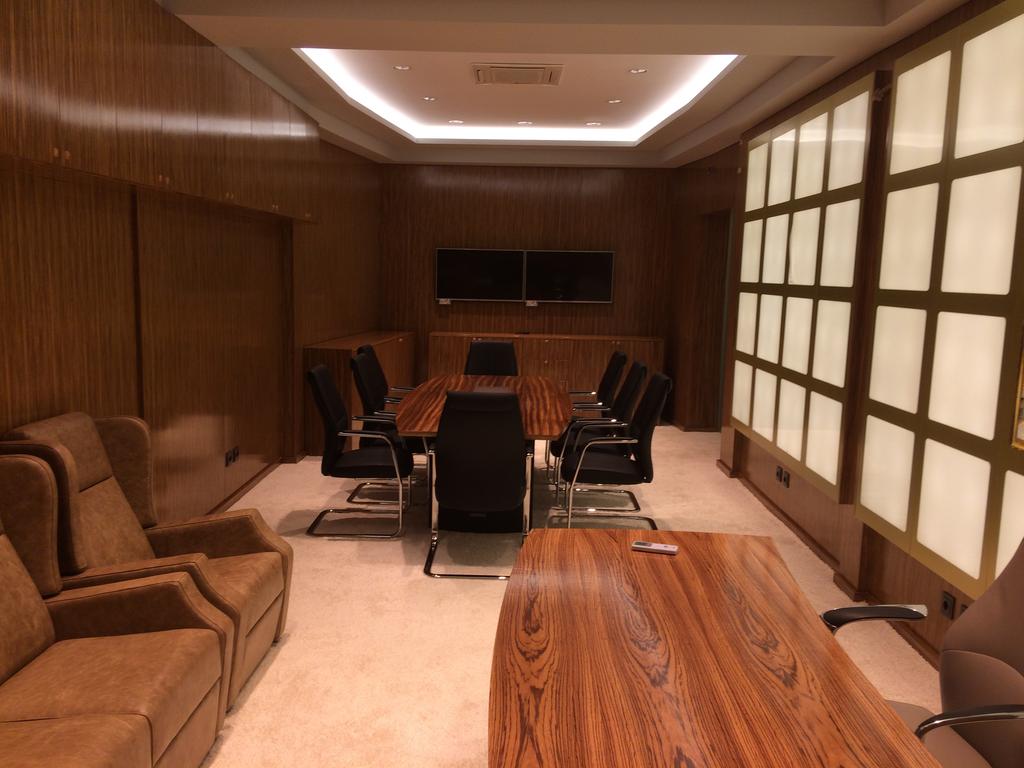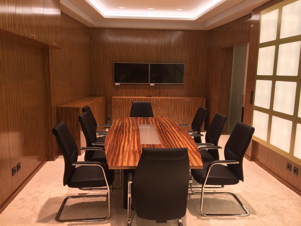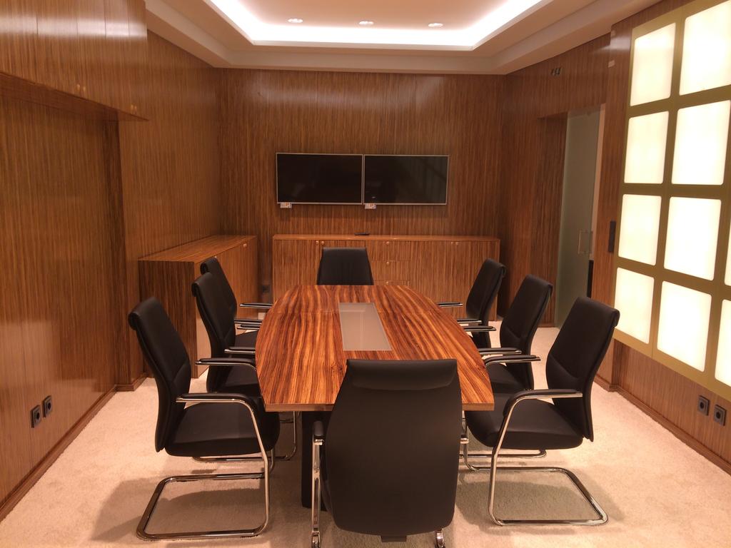 A proposta? Integrar no mesmo ambiente escritório, sala de reuniões e lounge. Possível graças à continuidade dos materiais e com uma conjugação sóbria de cores. Destaque para a caixa de luz que torna o espaço mais amplo e acolhedor.